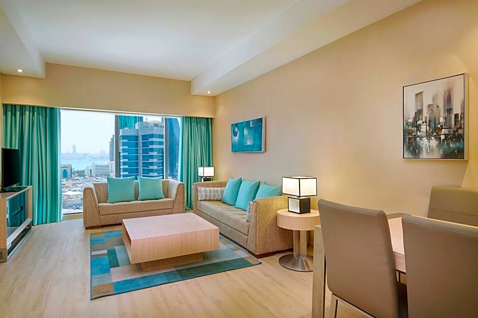 This nonsmoking, corner suite offers a living room, free Wi-Fi and city views. Facilities and services include daily housekeeping along with a mini-bar, an in-room safe and tea/coffee making facilities. A kitchenette with a microwave and a refrigerator is also available.